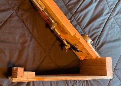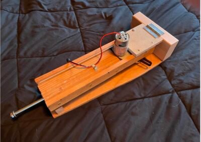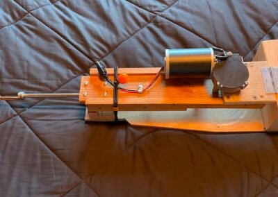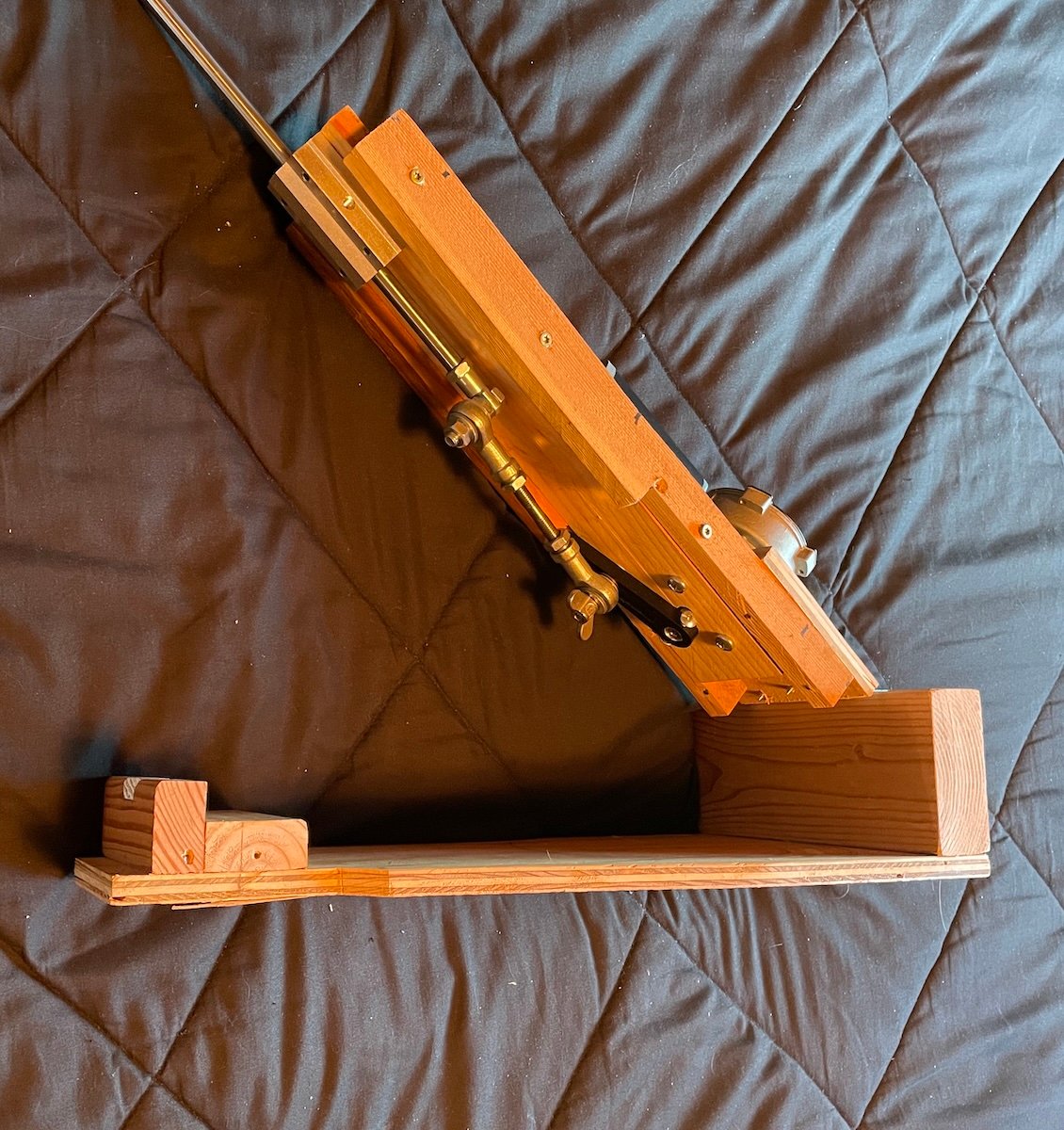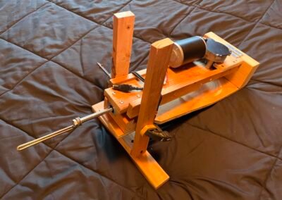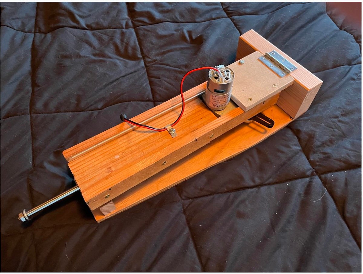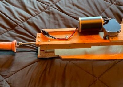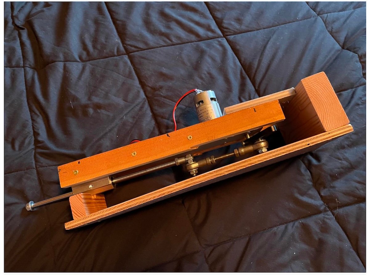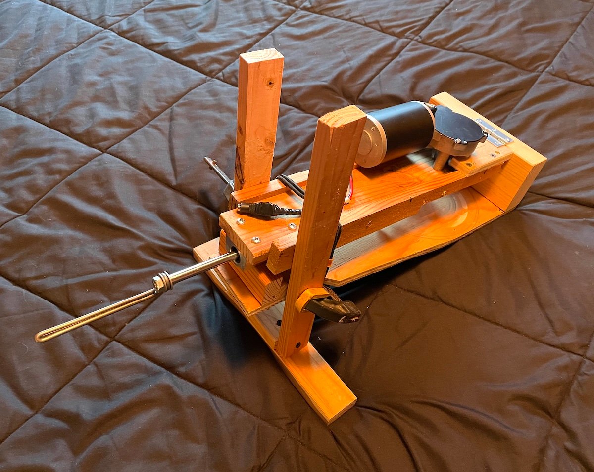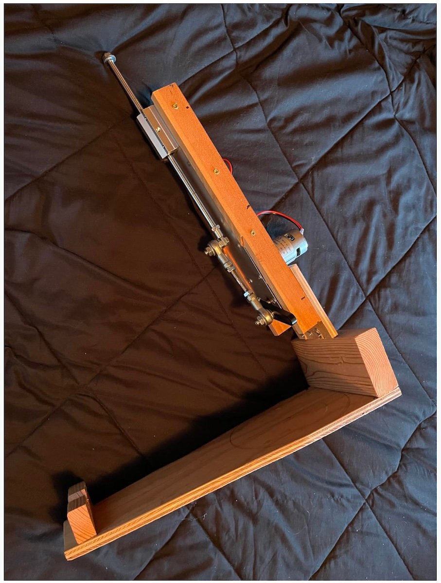 I rebuilt the machine with the new motor and an all wood frame. I replaced the nut that holds the linear actuator to the rocker arm with a wing nut, that makes it much easier to adjust the stroke, which can vary from 2 to 5 inches. It has the torque to start slowly and can go faster than one would want. And it is fairly quiet which is really nice.