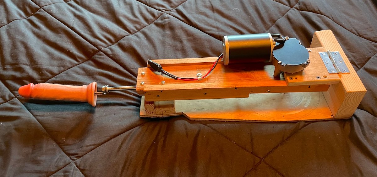 As I was searching for hardware, I found a pre-assembled unit on Amazon that had most of the hardware I was looking for. It came with the motor, rocker arm and linear push arm mounted to a piece of aluminum angle, it also came with a speed controller. At the time, it seemed like a good deal. I built a wood frame to mount that to and my first fuck machine was up and running.