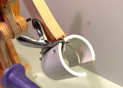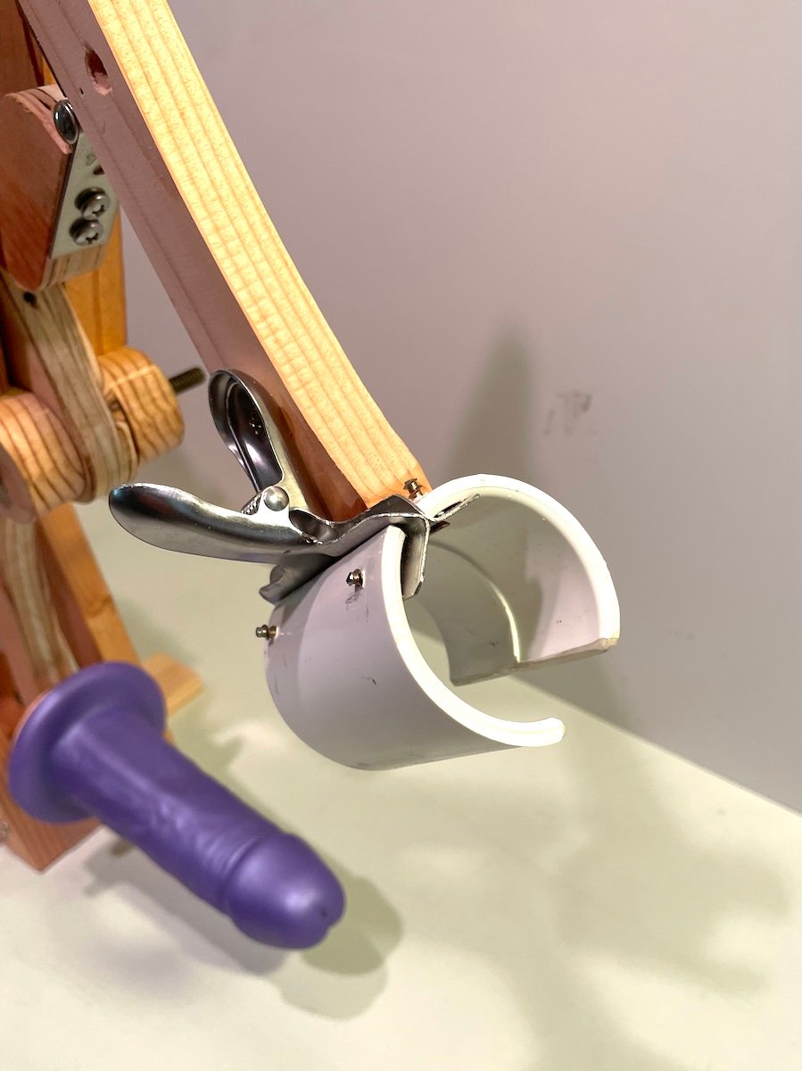 Figuring out the sleeve holder was tricky, I wanted to be able to get into position, slip a sleeve on to my cock and then attach to the machine. I ended up combining a spring clip with a pvc pipe connector that I had cut into two halves.