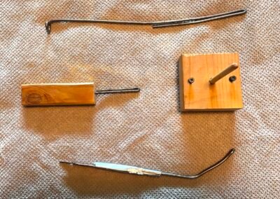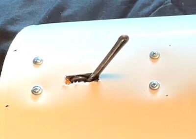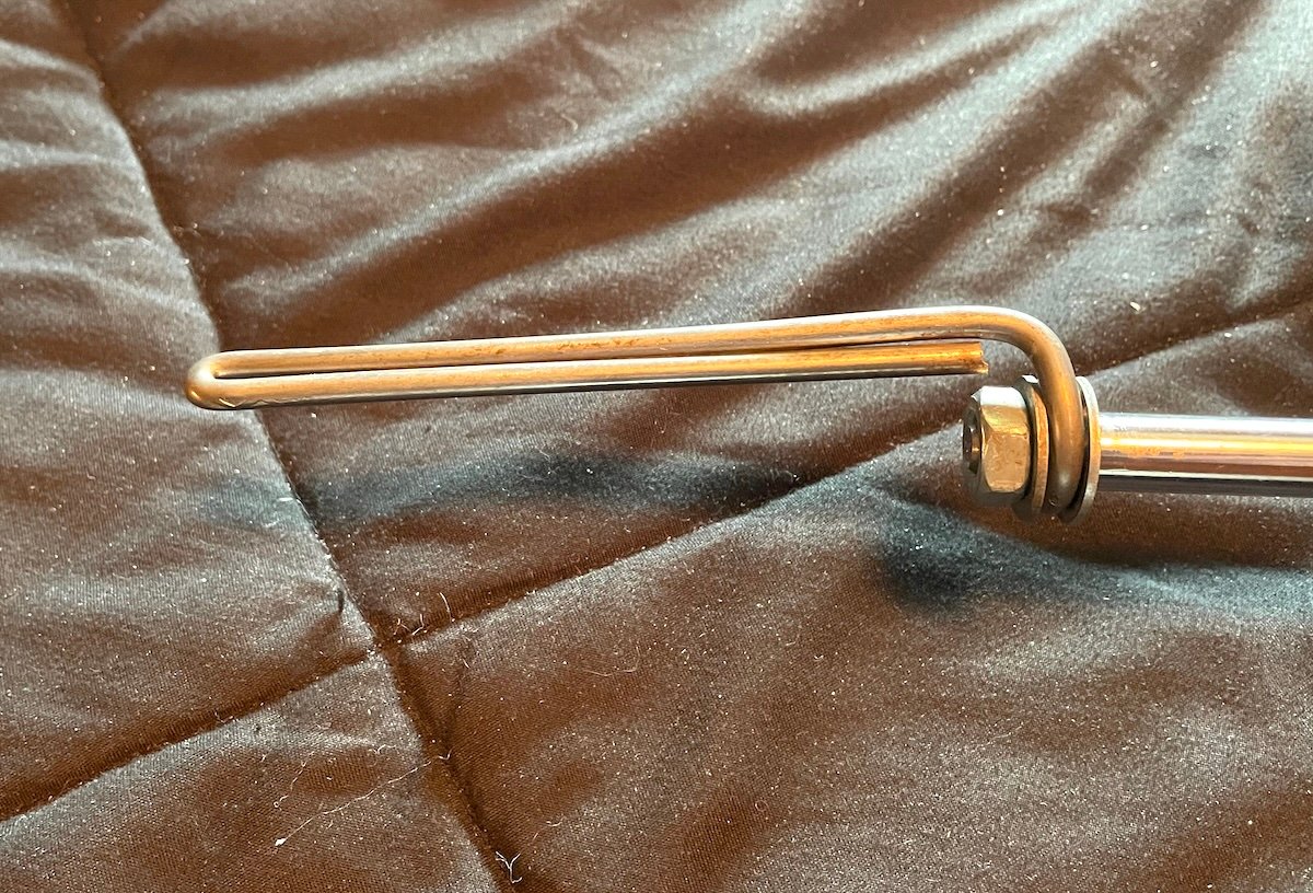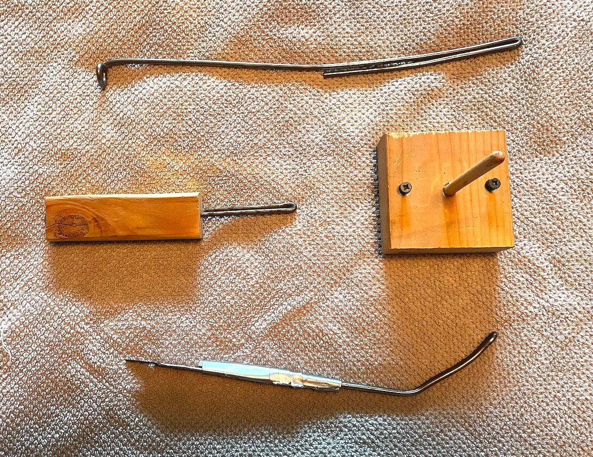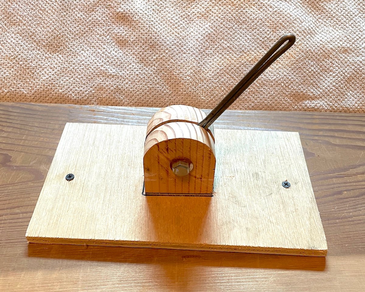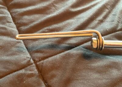 I did some digging in my shop and happened upon some old yard sign stakes, I have a box of them left over. They are made from a heavy gauge spring wire, I believe it’s 2 gauge, which is just under 1/4 inch thick. I can bend a curve into it by hand, but it takes effort. With the use of my bench vise, I was able to fold it tightly in half so I have a rounded end. Then I use a drill to carefully drill a hole into the bottom of dildo about three inches. I apply a touch of lube onto the tip of the wire and then shove it into the dildo. This makes it stiff at the base giving you the ability to direct the dildo in a certain direction.
